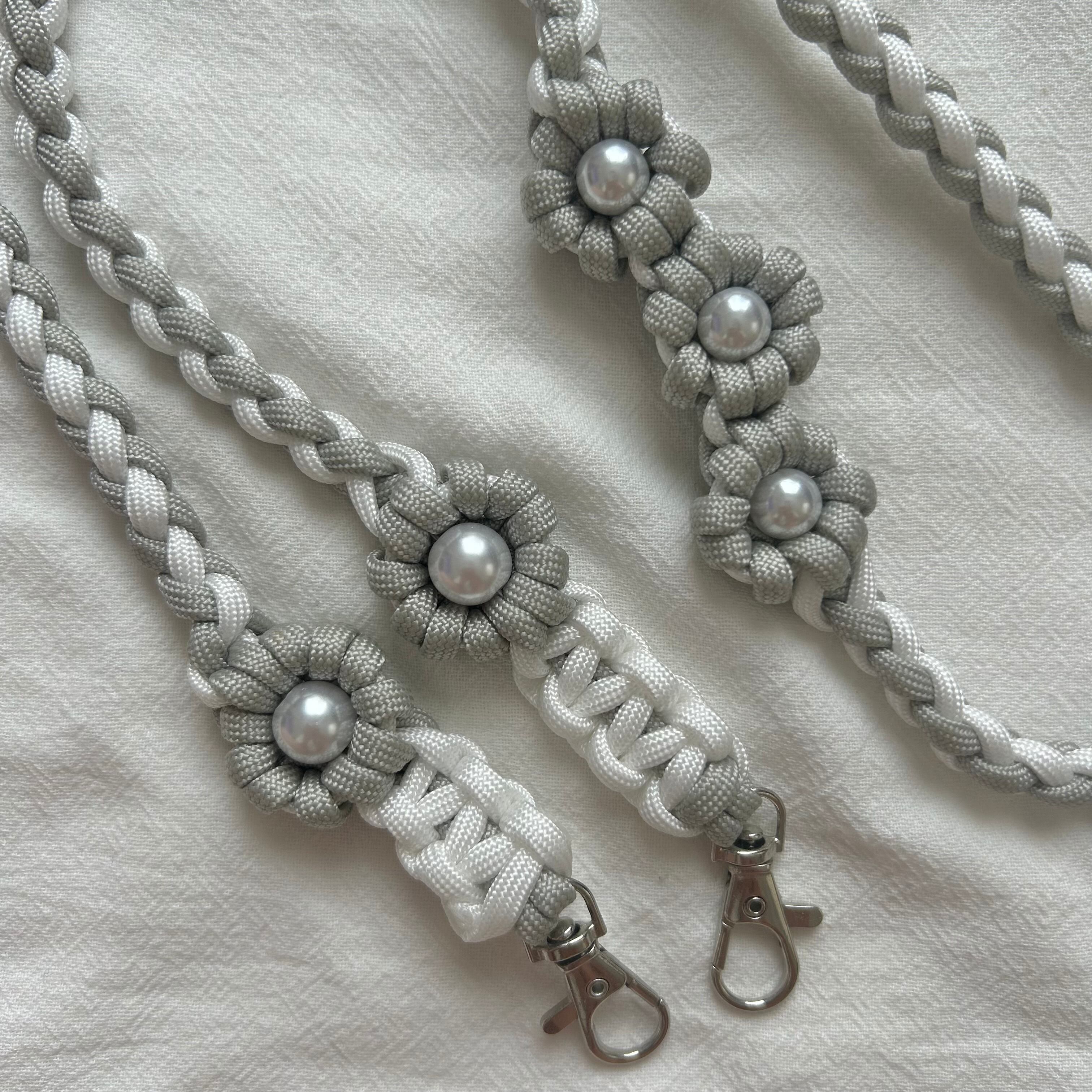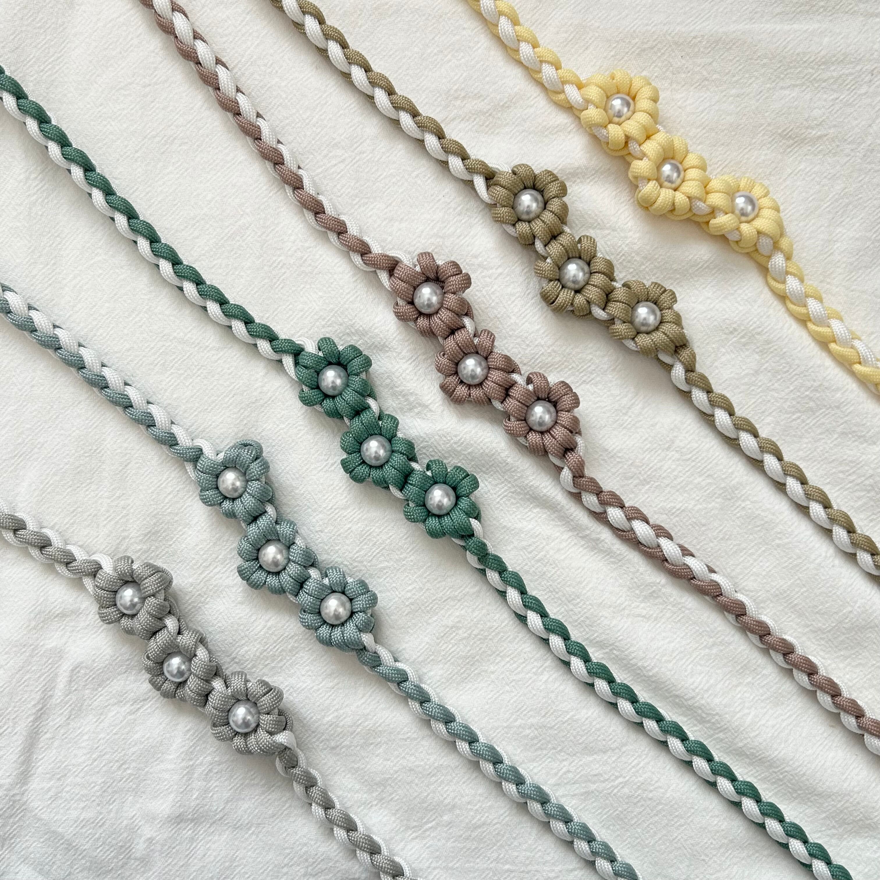 ・使用しているワックスコード、パラコードは焼き止め処理を行っている為、焼き跡が残っております。できる限り目立たないようにしておりますが、マクラメ編みの特性としてご理解いただきますよう、お願いいたします。