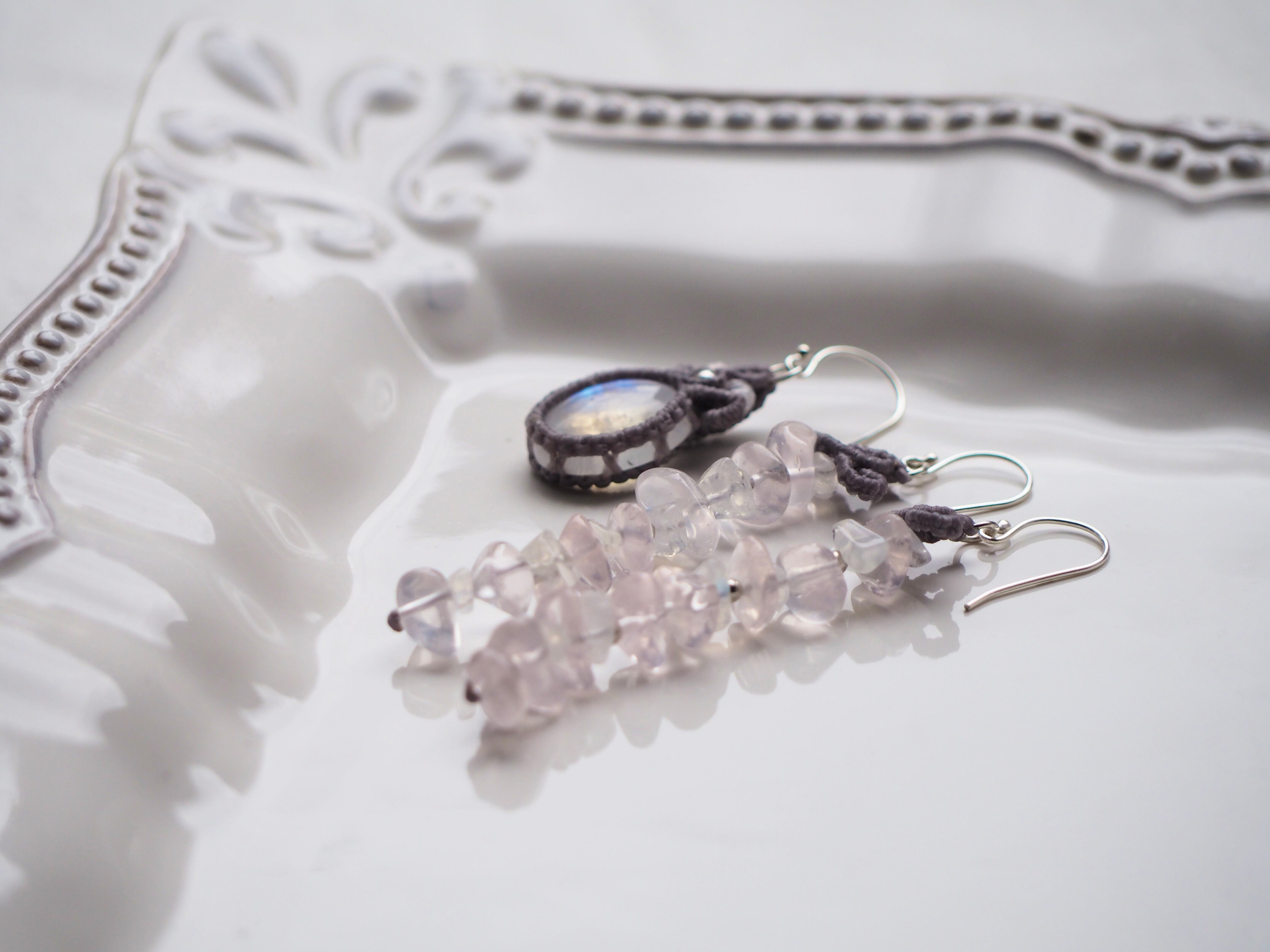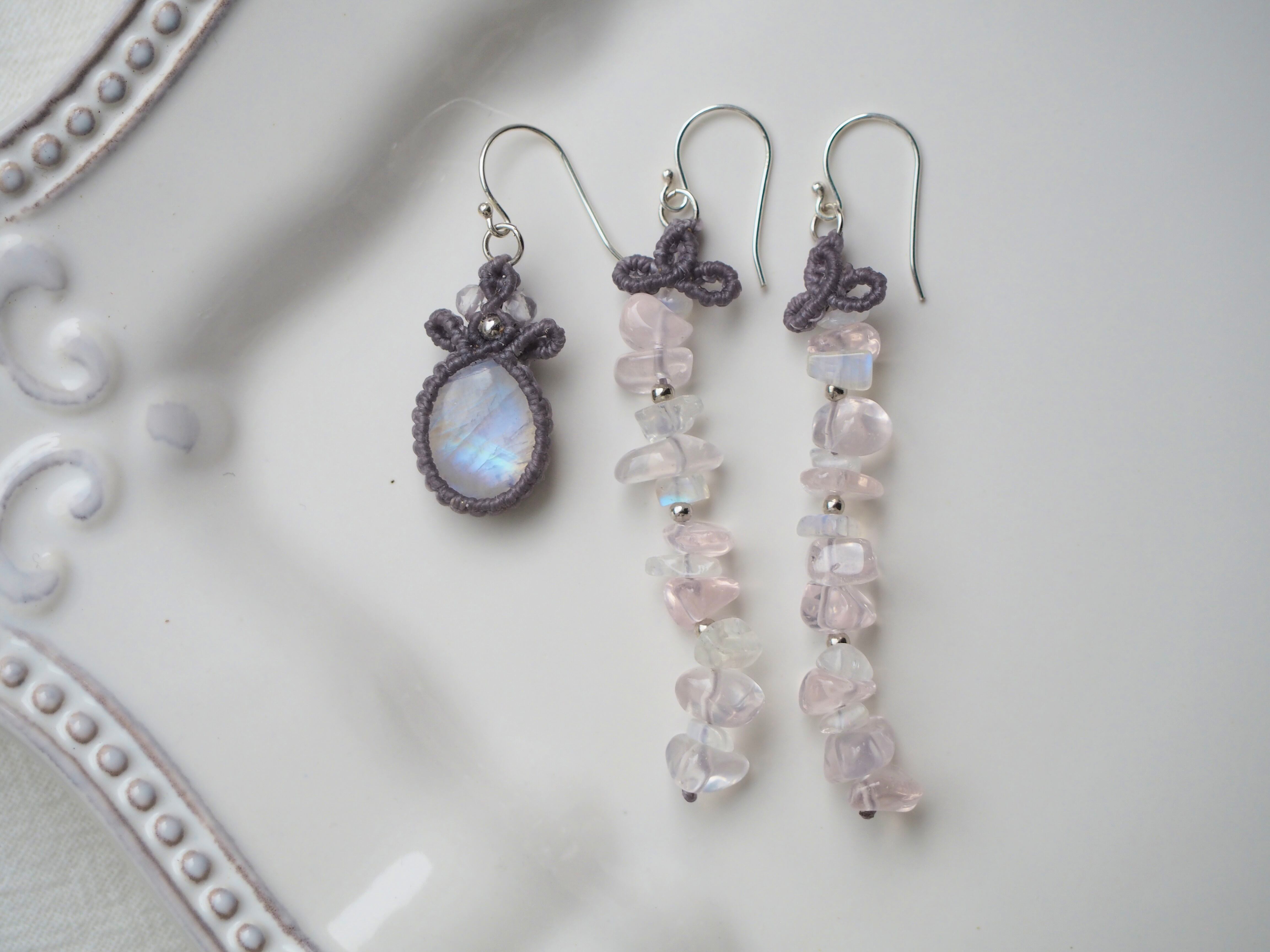ホワイトラブラドライト(レインボームーンストーン) マクラメ編みピアス 【Iris】シリーズ