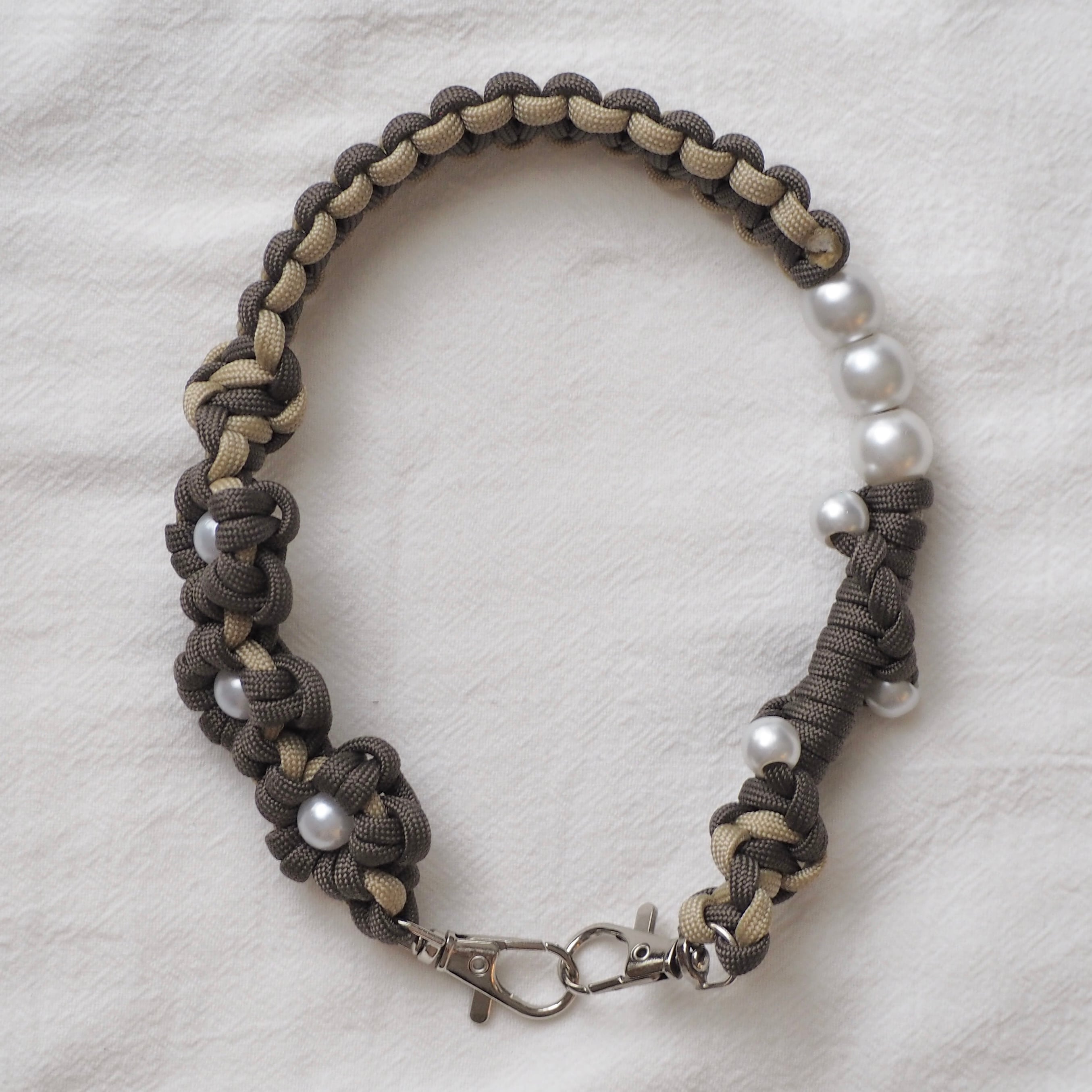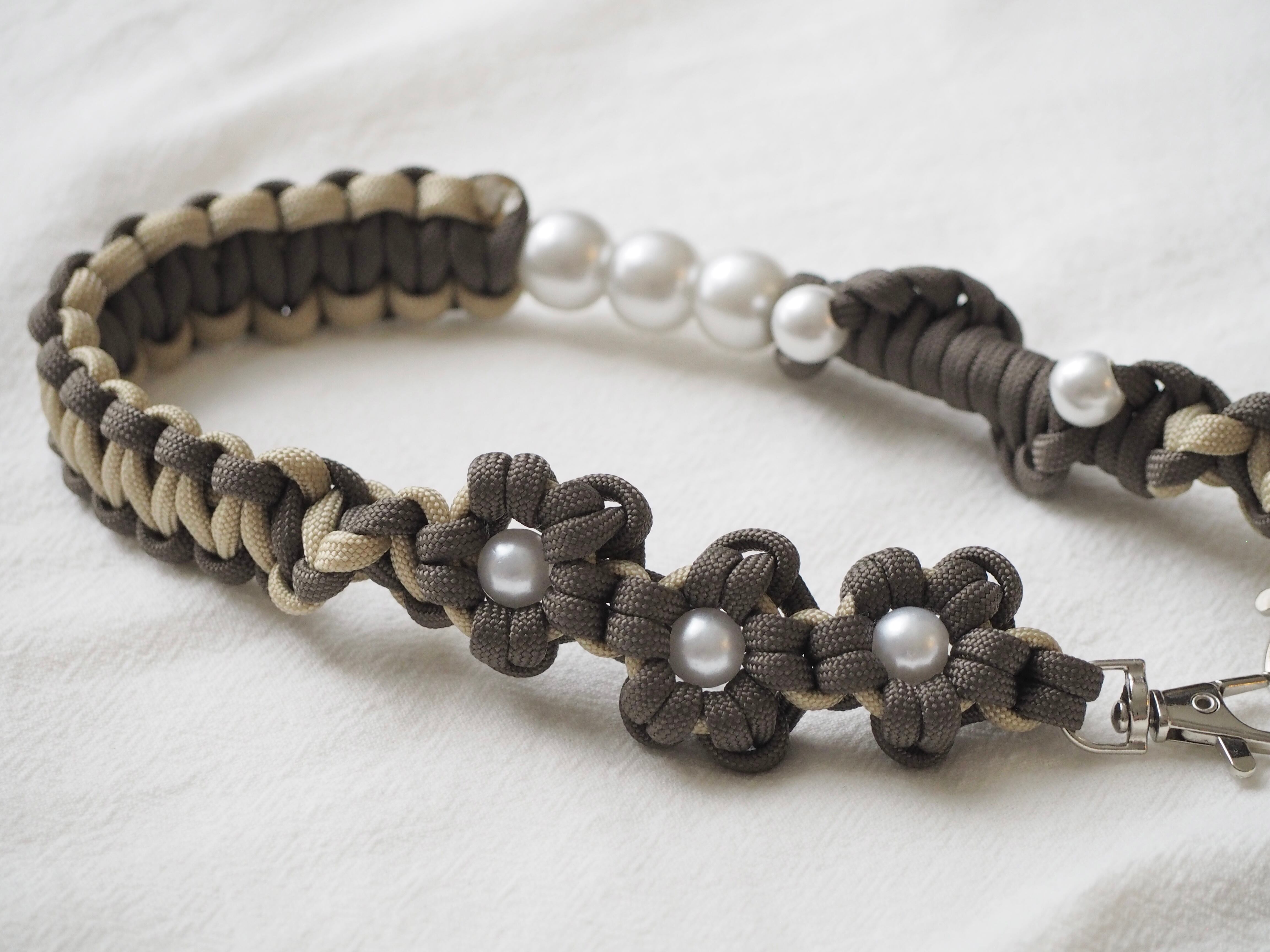 ・使用しているワックスコード、パラコードは焼き止め処理を行っている為、焼き跡が残っております。できる限り目立たないようにしておりますが、マクラメ編みの特性としてご理解いただきますよう、お願いいたします。