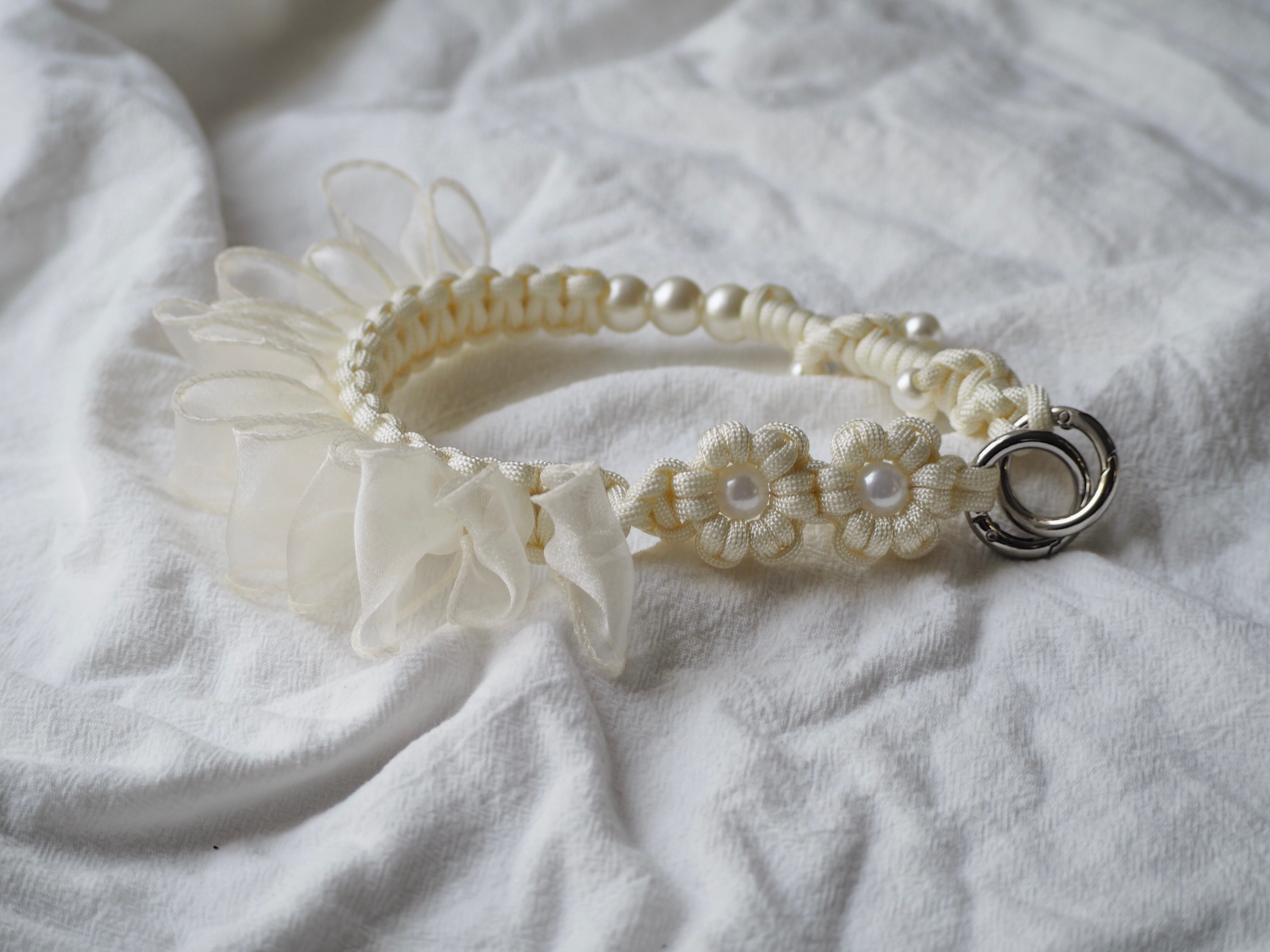 お花とパールのデザインに加えて、オーガンジーリボンを編み込みました。