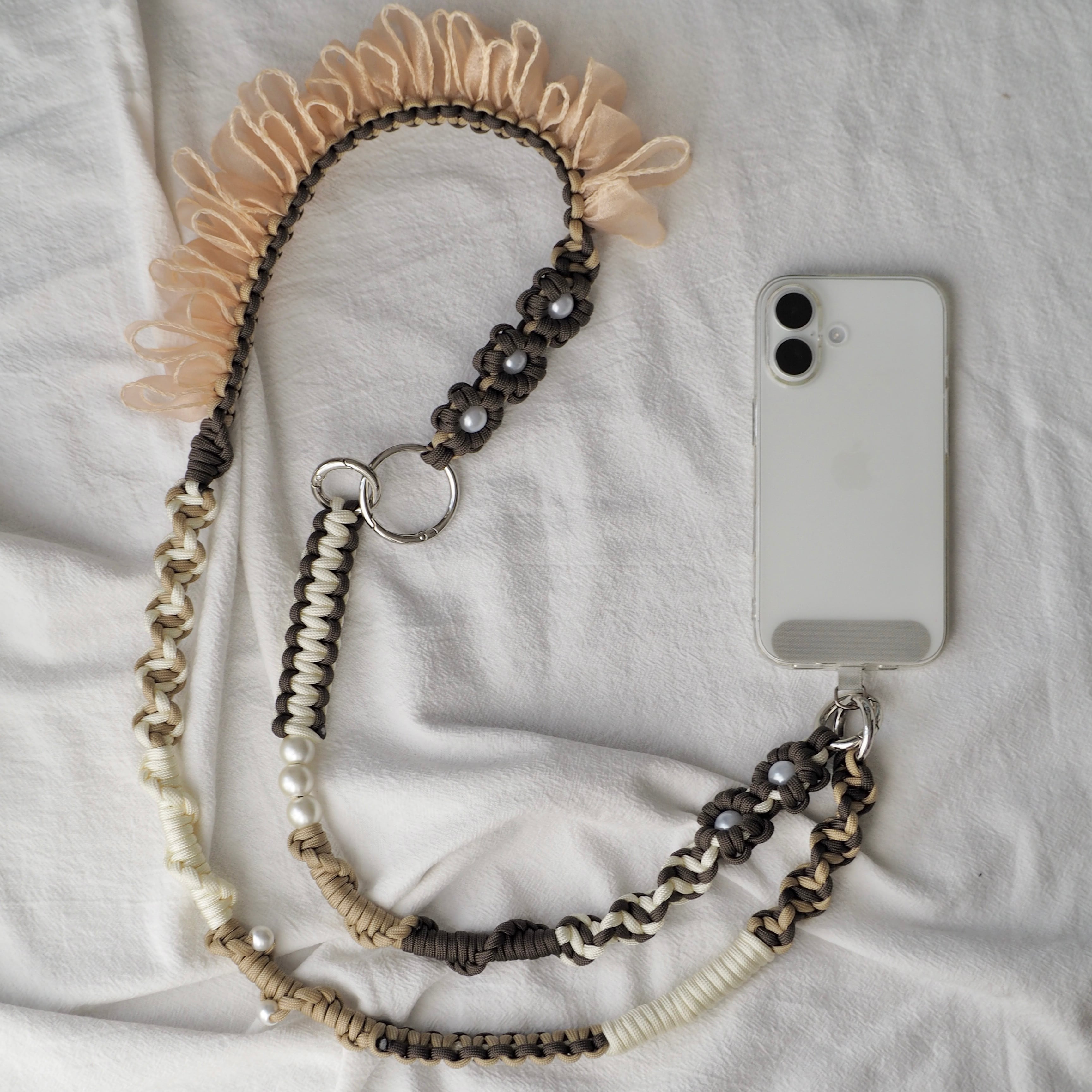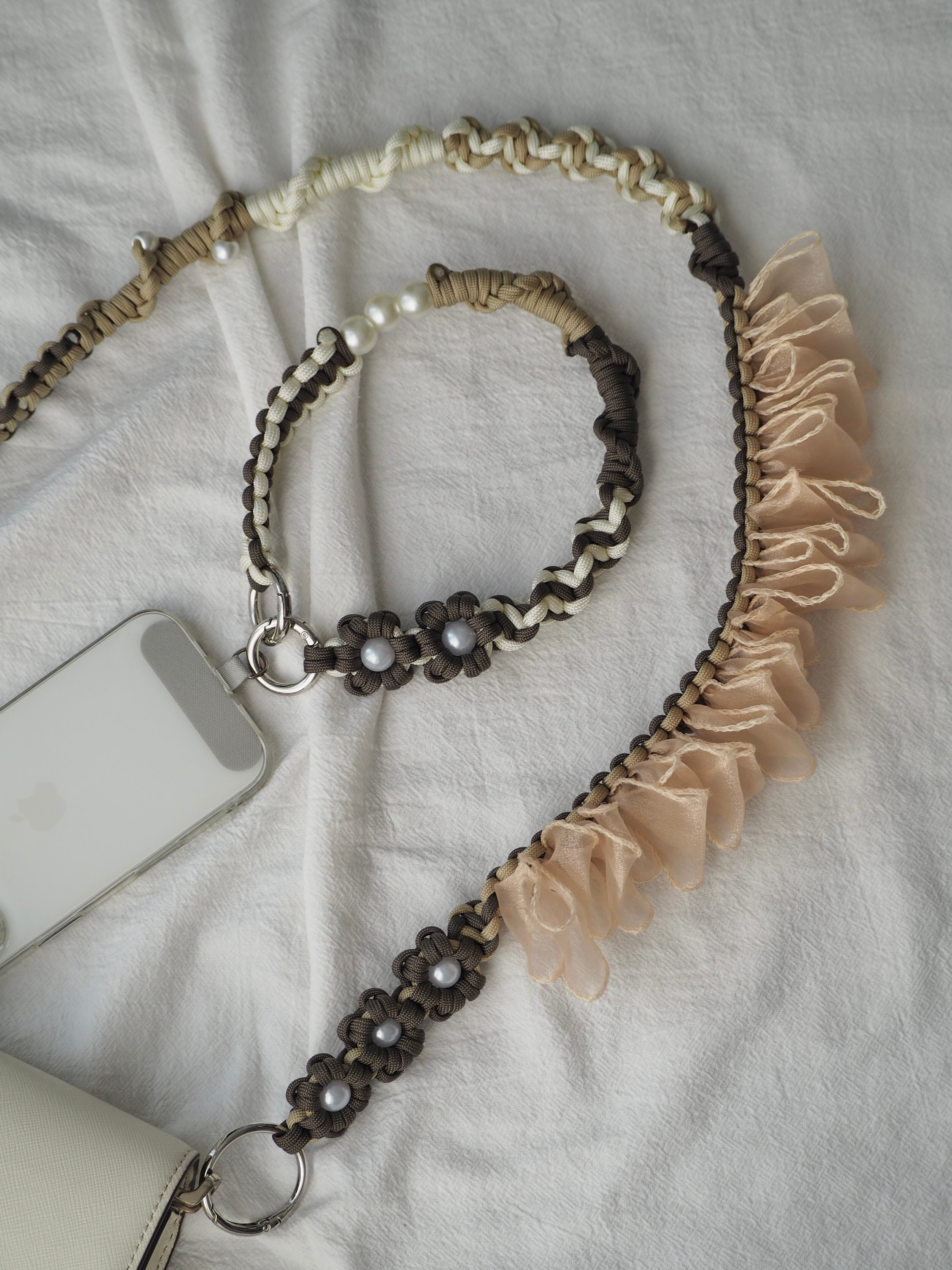 ・使用しているワックスコード、パラコードは焼き止め処理を行っている為、焼き跡が残っております。できる限り目立たないようにしておりますが、マクラメ編みの特性としてご理解いただきますよう、お願いいたします。