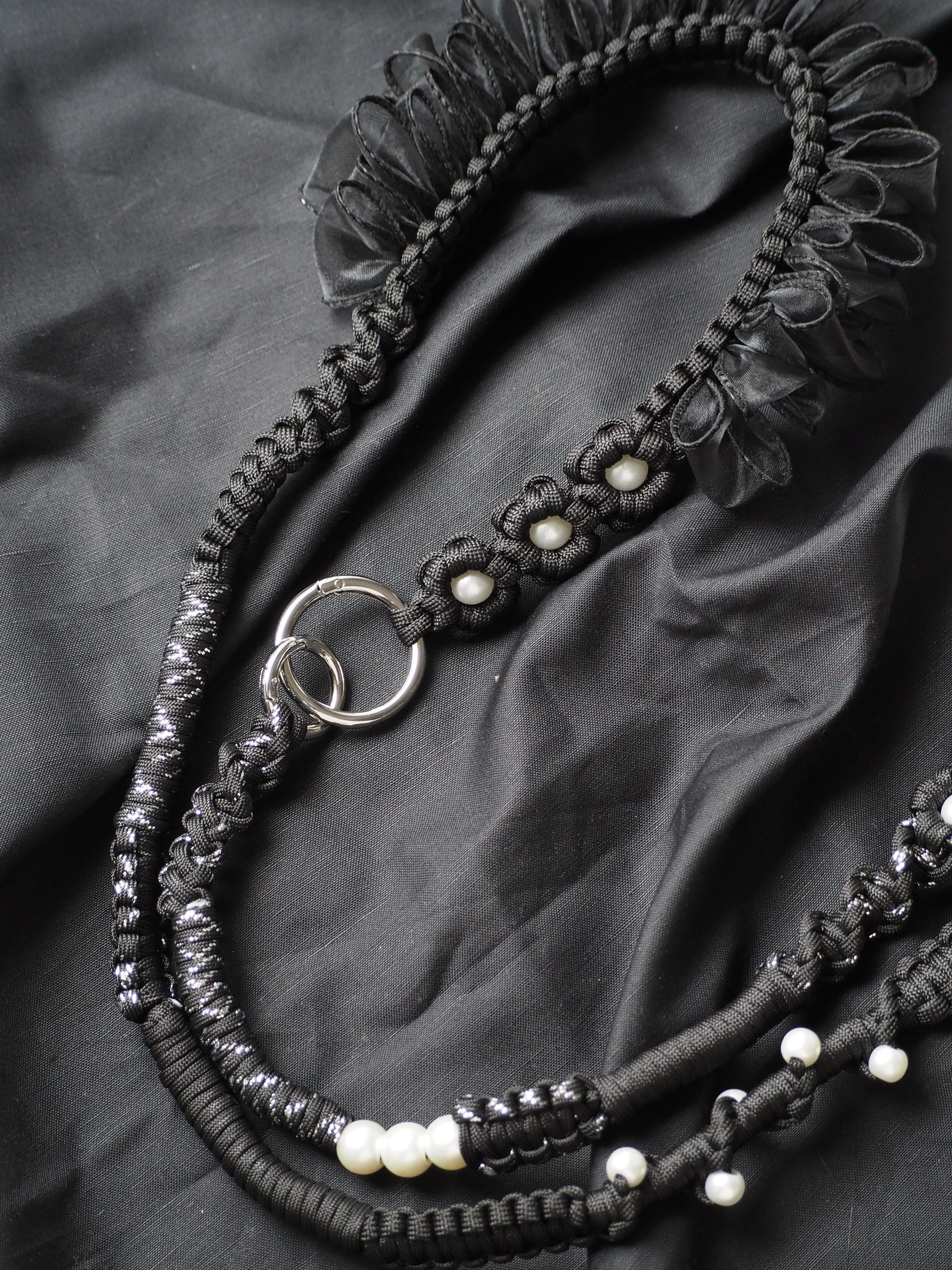 ・使用しているワックスコード、パラコードは焼き止め処理を行っている為、焼き跡が残っております。できる限り目立たないようにしておりますが、マクラメ編みの特性としてご理解いただきますよう、お願いいたします。