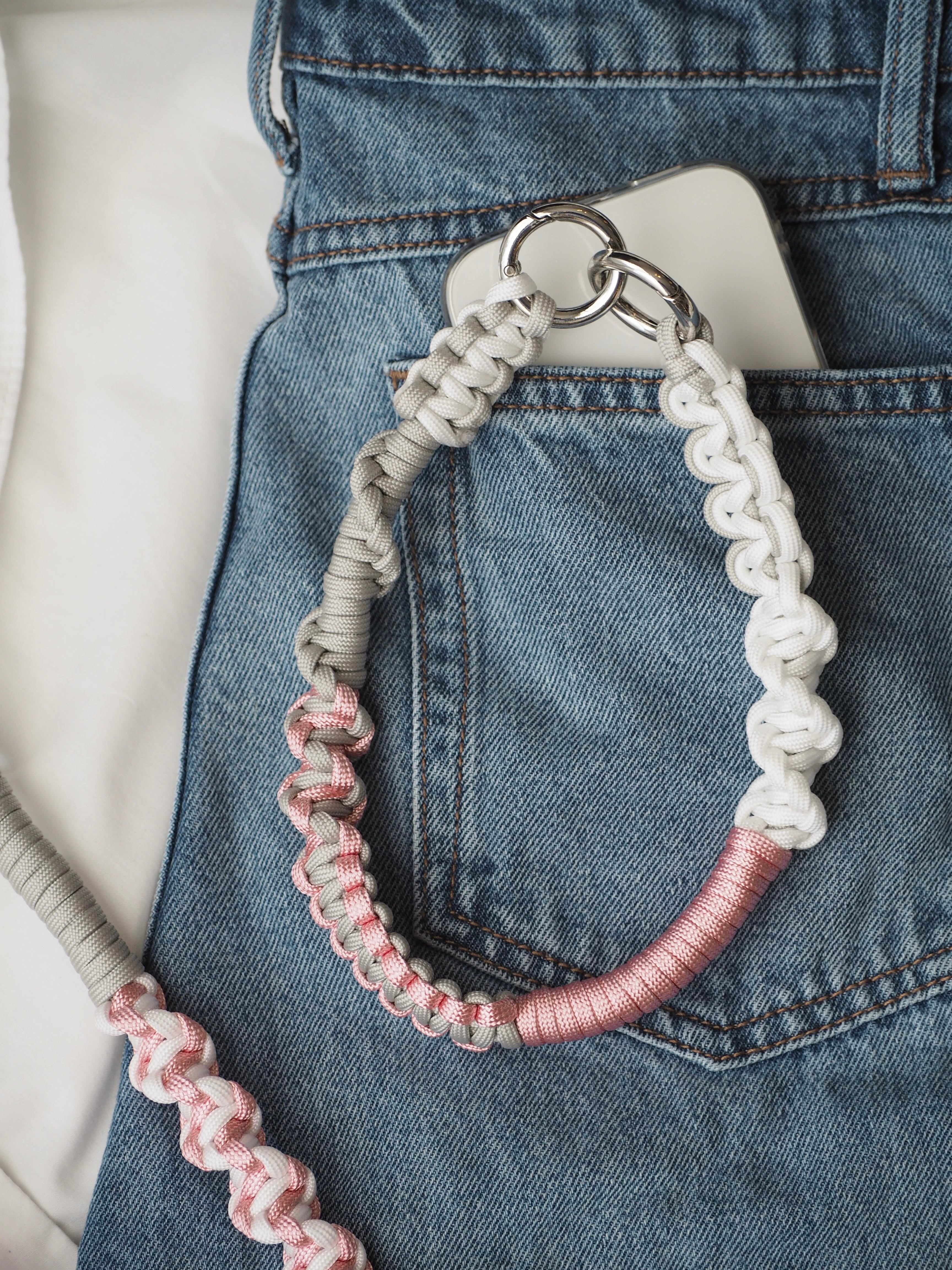 ・使用しているワックスコード、パラコードは焼き止め処理を行っている為、焼き跡が残っております。できる限り目立たないようにしておりますが、マクラメ編みの特性としてご理解いただきますよう、お願いいたします。