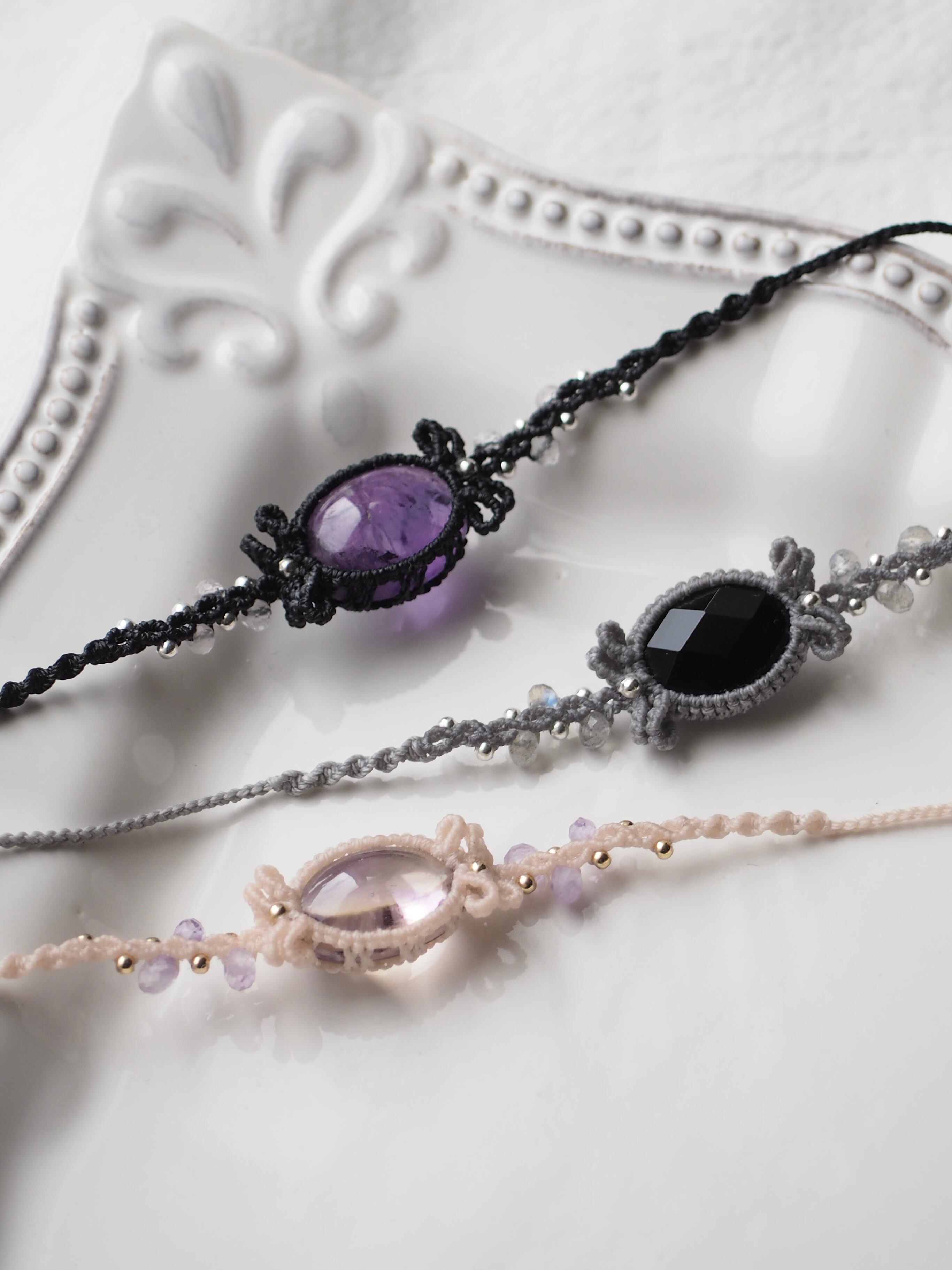 光が差し込むと美しい薄紫色に輝くアメジストを使った、マクラメ編みブレスレットです。