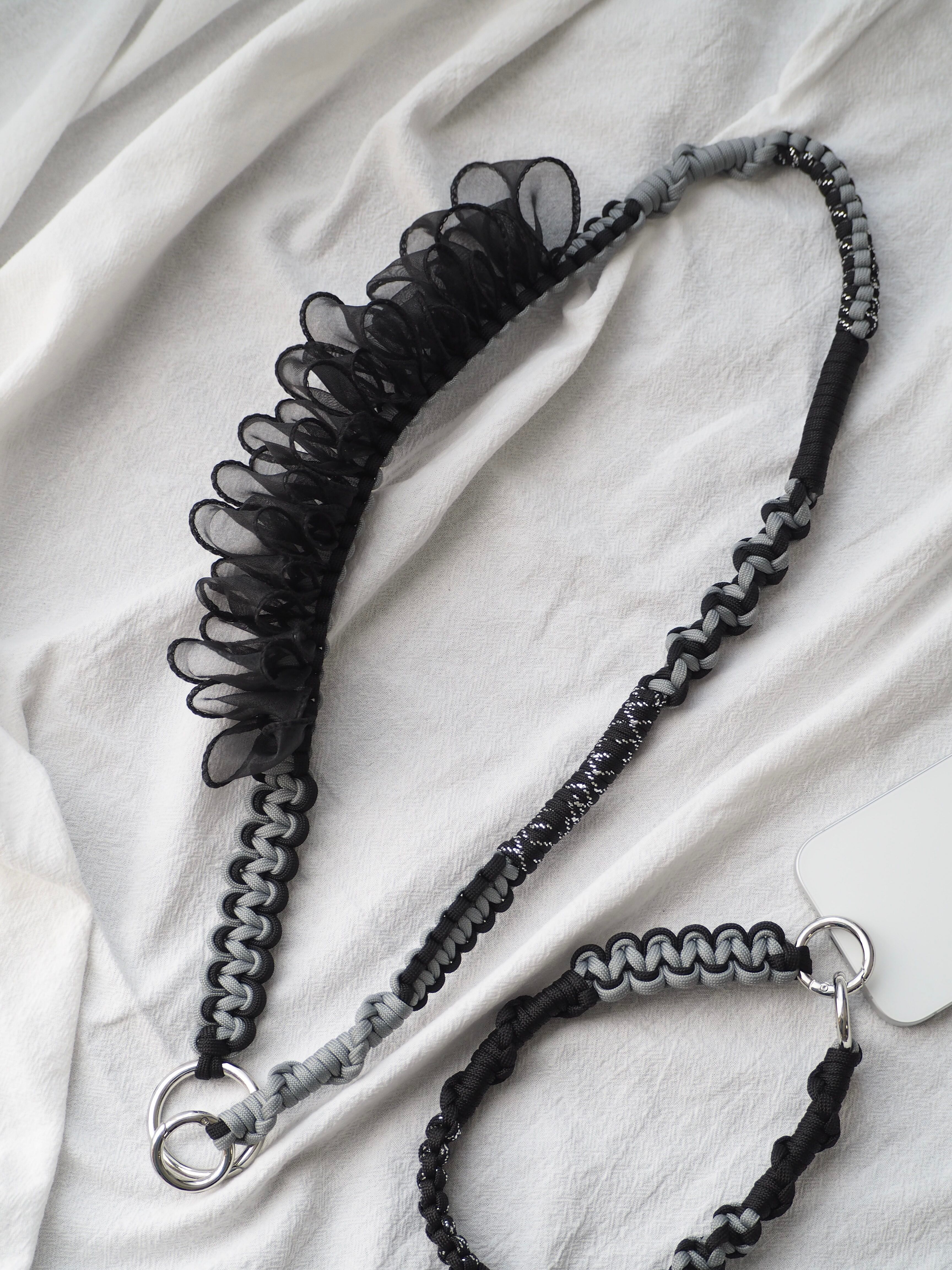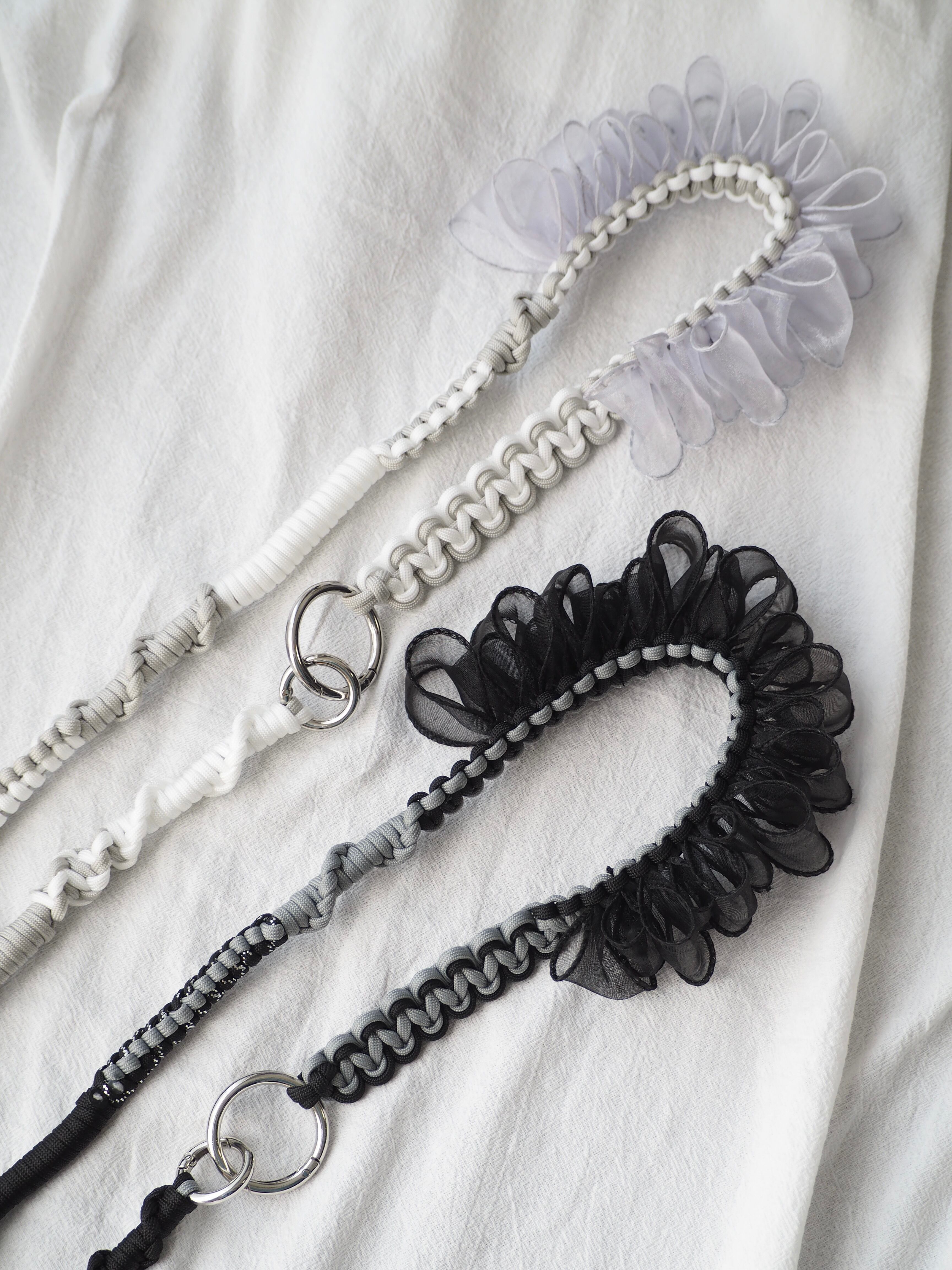 ・使用しているワックスコード、パラコードは焼き止め処理を行っている為、焼き跡が残っております。できる限り目立たないようにしておりますが、マクラメ編みの特性としてご理解いただきますよう、お願いいたします。