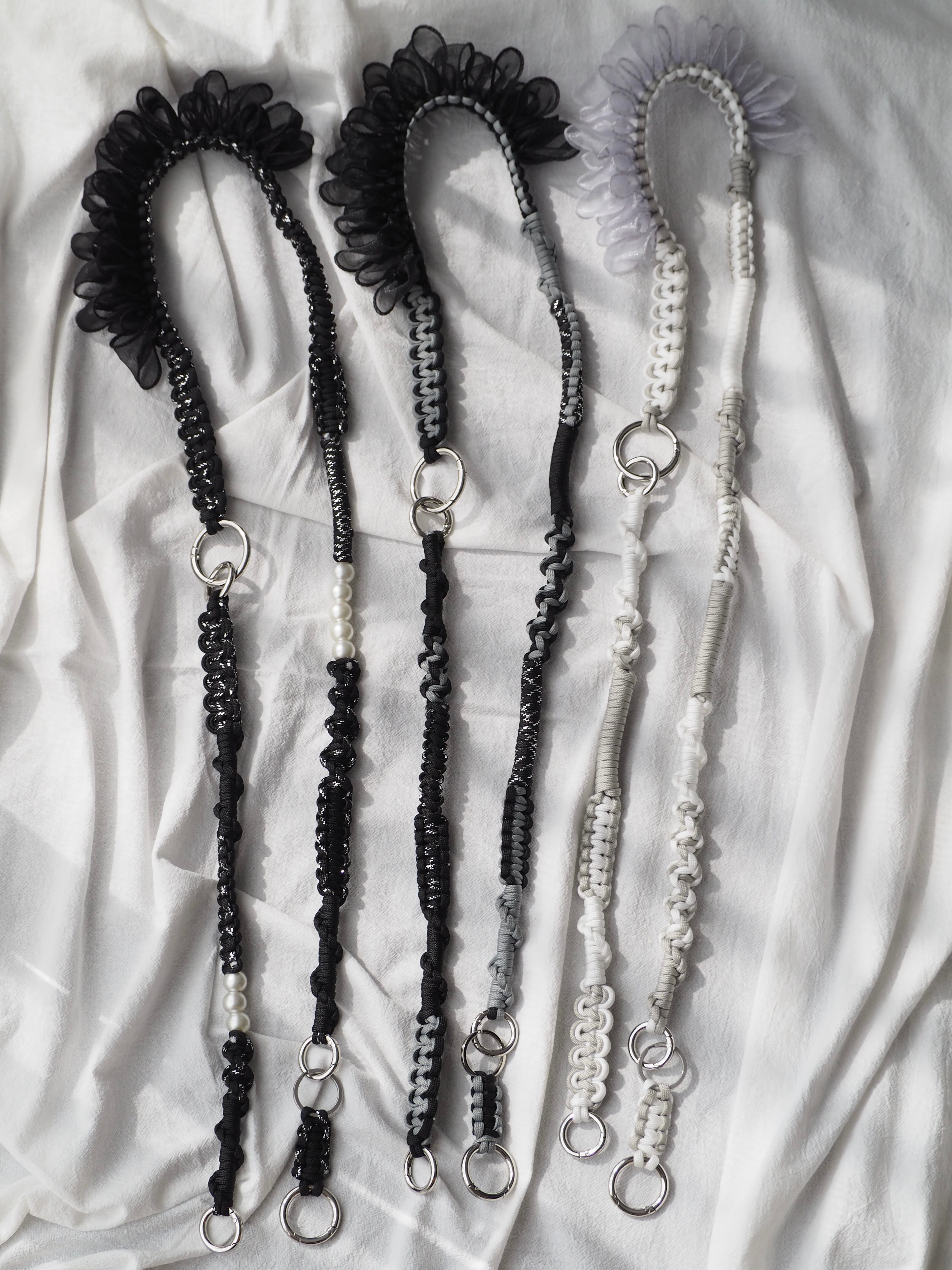 ・使用しているワックスコード、パラコードは焼き止め処理を行っている為、焼き跡が残っております。できる限り目立たないようにしておりますが、マクラメ編みの特性としてご理解いただきますよう、お願いいたします。