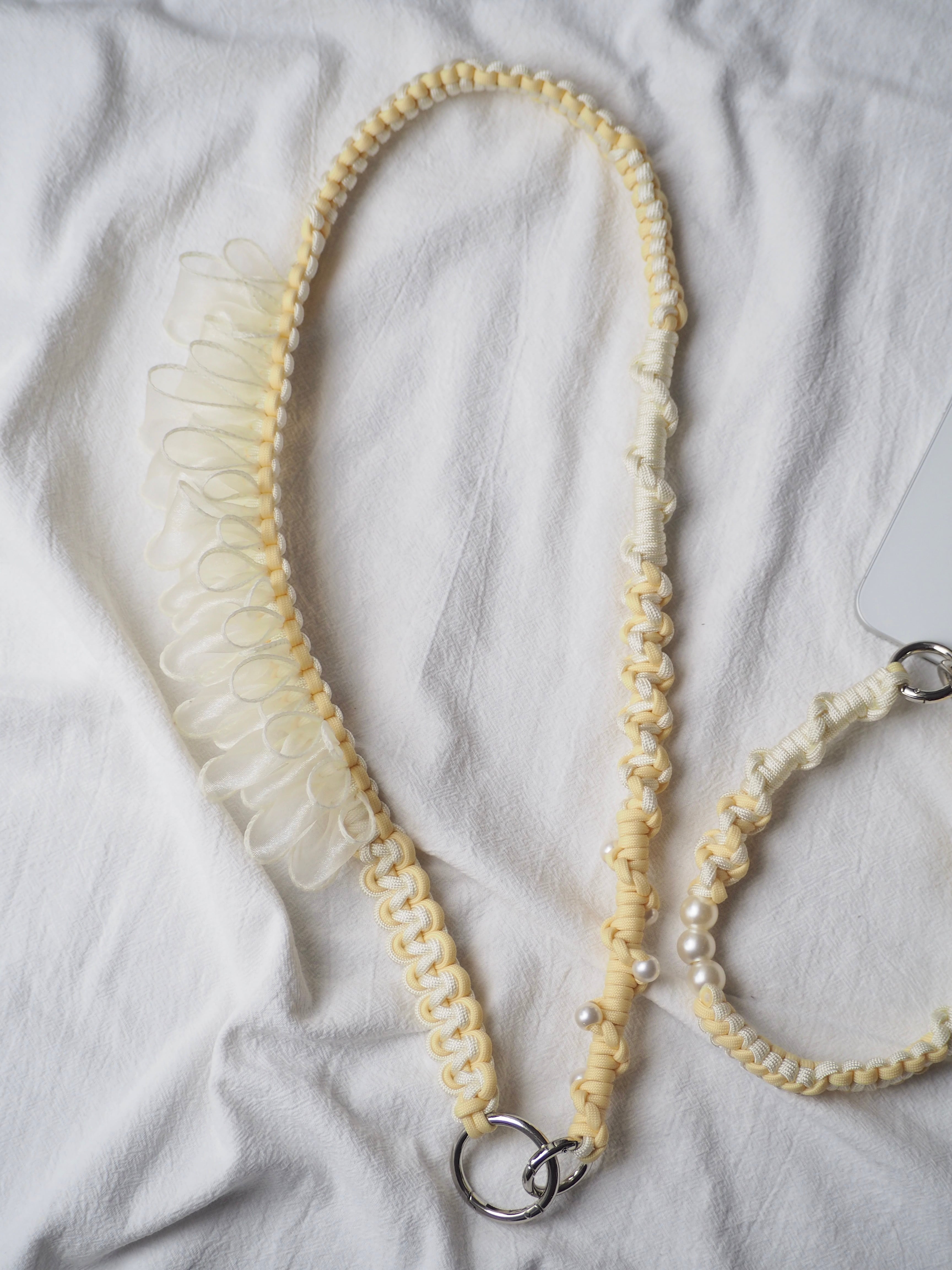 ・使用しているワックスコード、パラコードは焼き止め処理を行っている為、焼き跡が残っております。できる限り目立たないようにしておりますが、マクラメ編みの特性としてご理解いただきますよう、お願いいたします。