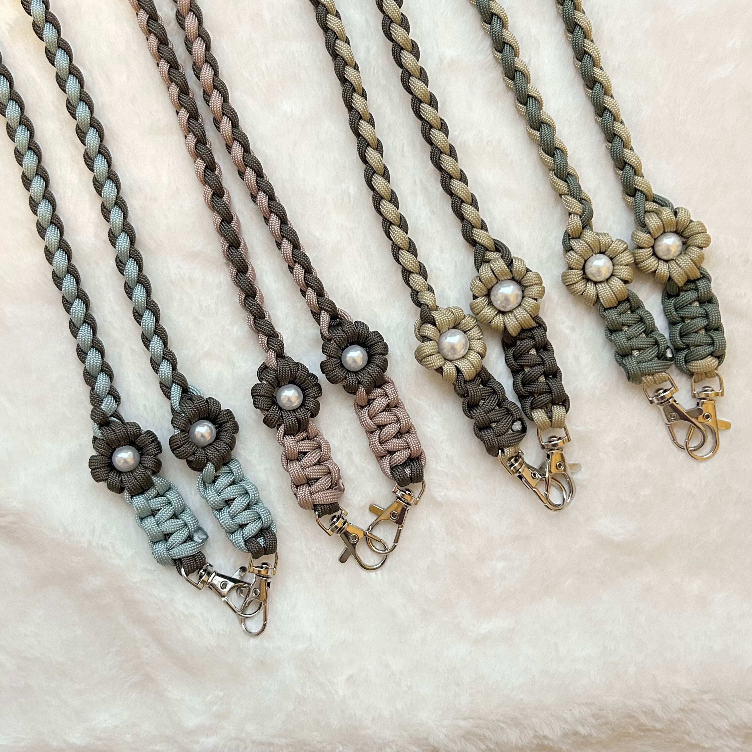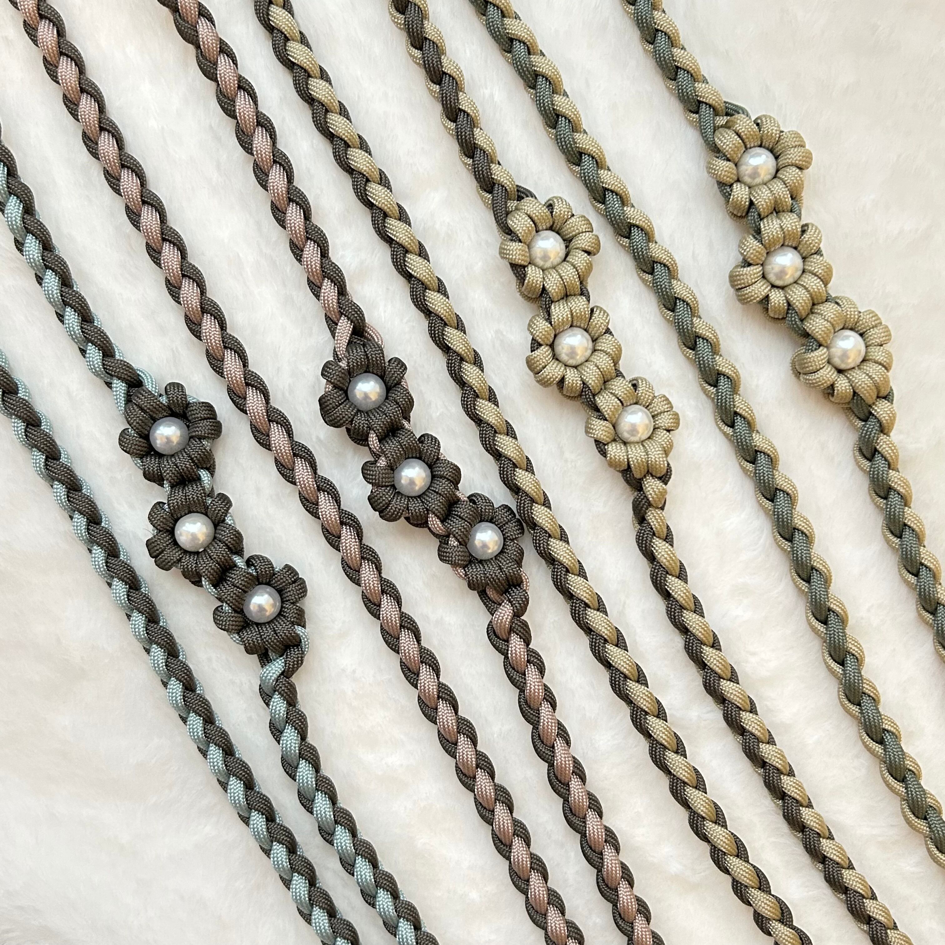 ・使用しているワックスコード、パラコードは焼き止め処理を行っている為、焼き跡が残っております。できる限り目立たないようにしておりますが、マクラメ編みの特性としてご理解いただきますよう、お願いいたします。
