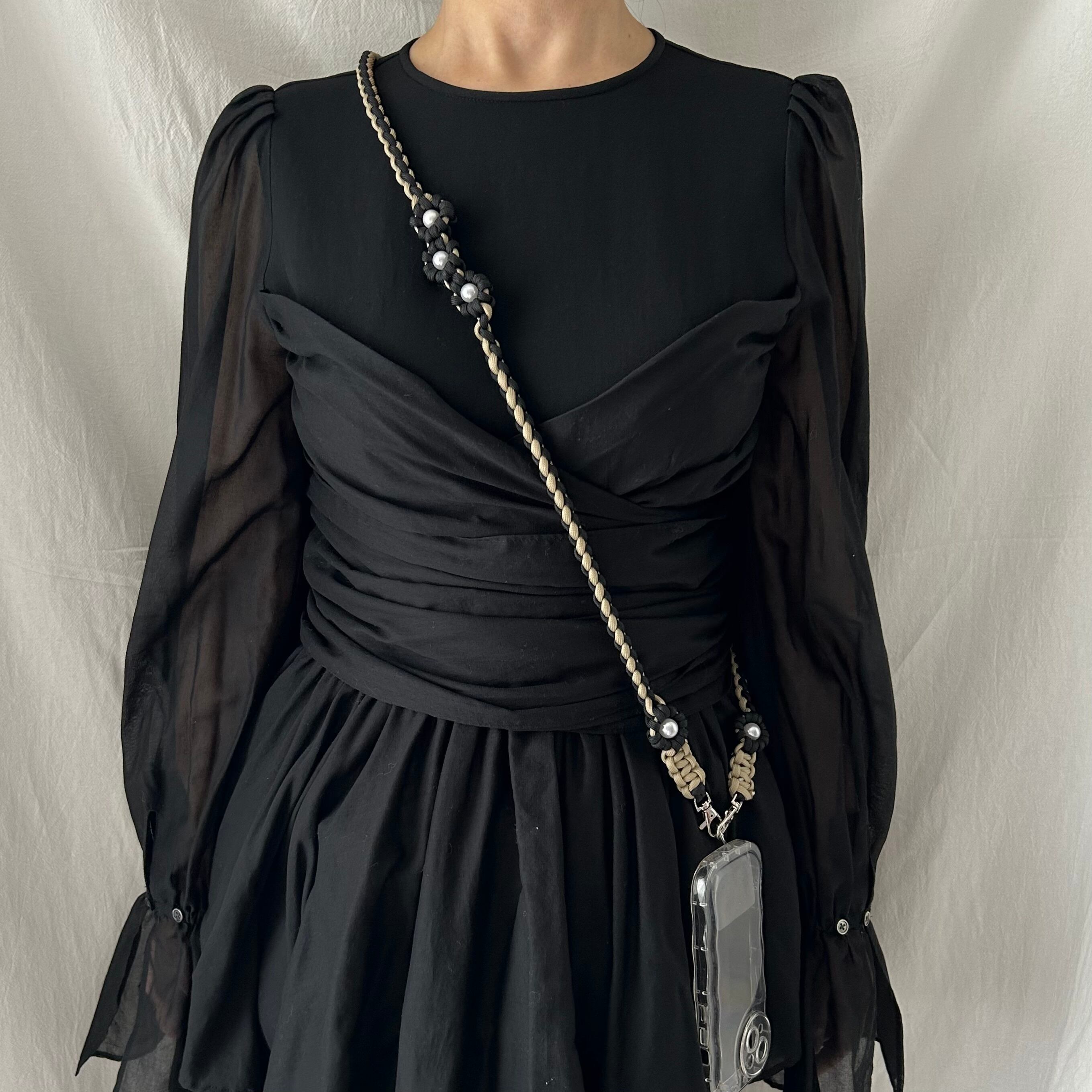 胸元と腰(スマホの手元にくる部分)あたりにパールを使ったお花のデザインを入れました。