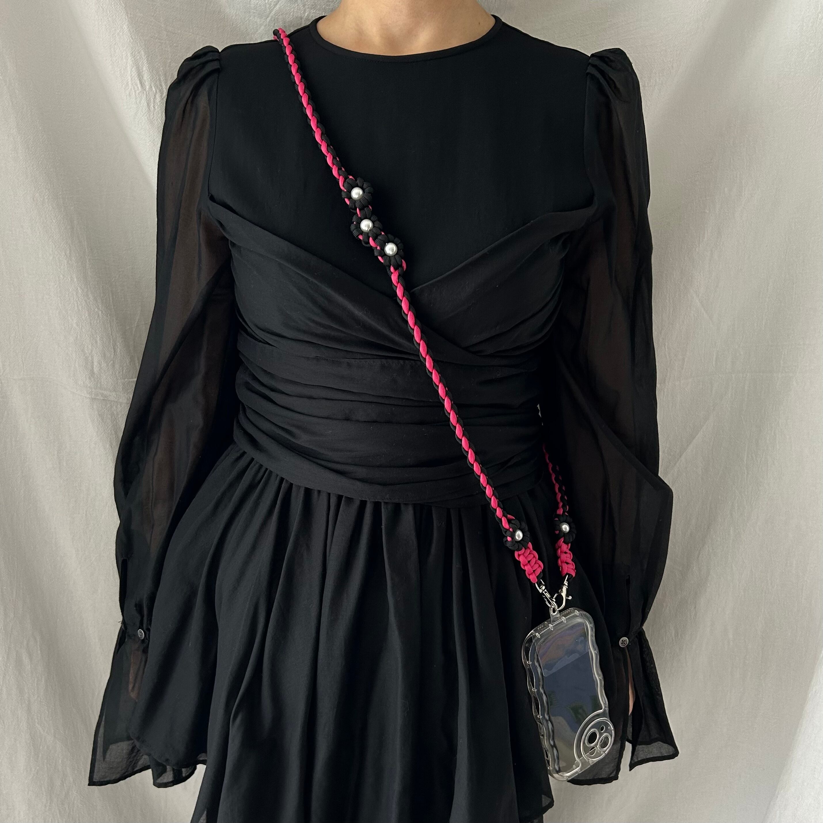 胸元と腰(スマホの手元にくる部分)あたりにパールを使ったお花のデザインを入れました。